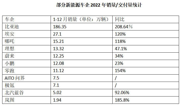 在此前一日,多家新能源车企均早早公布了2022年销量“喜报”,其中广汽埃安2022全年销量达到27.1万辆,同比增长120%,创造了公司交付量新纪录。