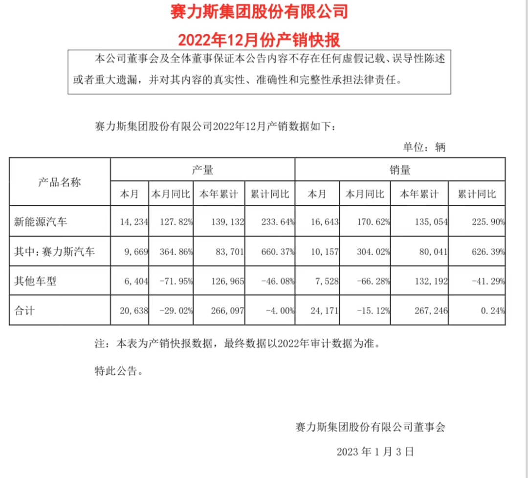 1月2日,赛力斯(601127)披露2022年12月产销快报,公司去年12月销售新能源汽车1.66万辆,同比增长170.62%;其中,赛力斯汽车销量1.02万辆,同比增长304.02%。1-12月赛力斯累计销售新能源汽车13.51万辆,同比增长225.90%。其中,赛力斯汽车累计销量8万辆,同比大涨626.39%。