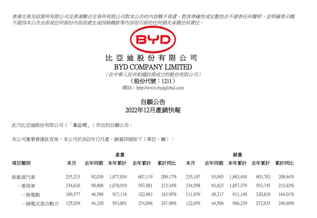 其中,比亚迪股份在港交所公告,2022年12月新能源汽车销量23.52万辆,同比增长150%;全年新能源汽车累计销量186.35万辆,同比增长208.64%。
